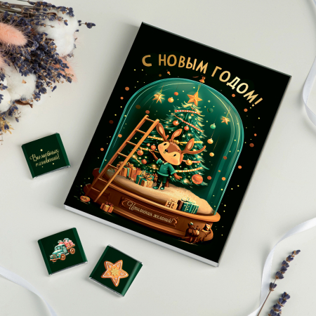 Каждая шоколадка упакована в индивидуальную этикетку с пожеланием.
