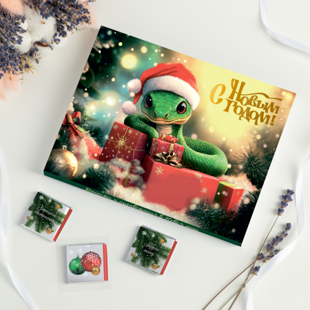 Каждая шоколадка упакована в индивидуальную этикетку с пожеланием.