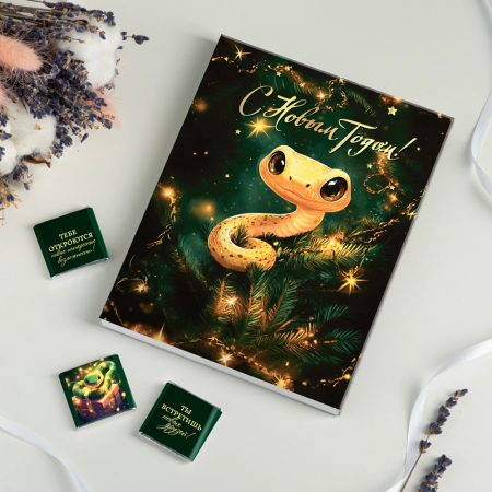 Каждая шоколадка упакована в индивидуальную этикетку с пожеланием.