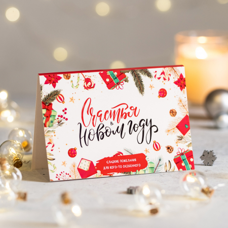 Внутри открытки - 4 шоколадки (вес каждой шоколадки: 5 гр., размер: 31 х 31 мм.)