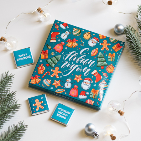Каждая шоколадка упакована в индивидуальную этикетку с пожеланием.