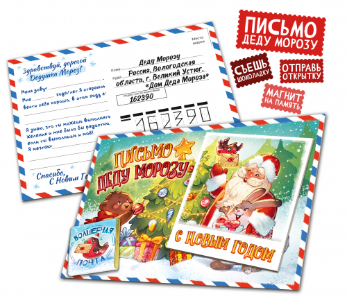 Уникальная открытка-сувенир, которая не имеет аналогов на рынке! Комплект состоит из шоколадки, новогоднего магнита и красочной почтовой карточки. Шоколадку можно с удовольствием съесть, магнит приклеить на холодильник, а в открытке нужно написать Деду Морозу самые заветные желания и отправить почтой (главное не забыть приклеить марку).