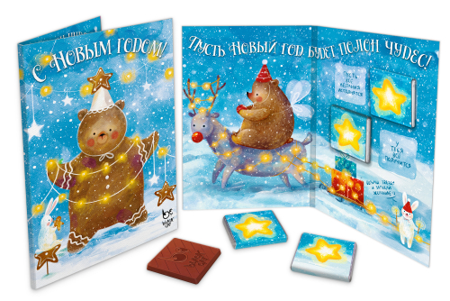 Вкусные подарки в виде открыток подарят множество ярких эмоций получателю. Что может быть лучше приятных слов?! Только приятные слова дополненные шоколадкой, а тут их целых 4!
