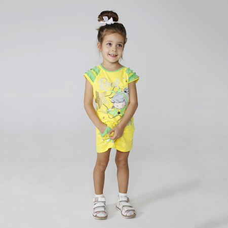 Размерный ряд: 104, 110, 122, 128, 134. Комплект: майка, шорты. Ткань: кулирка. Состав: 100% хлопок. Размер 104: Ог - 58 см, Об - 61 см, Длина талии спинки - 25 см, От - 55 см.