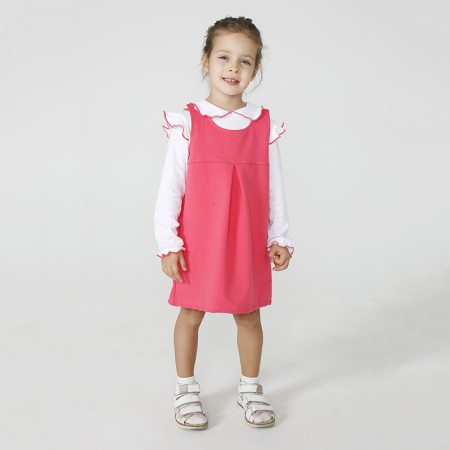 Размерный ряд: 92, 98, 104, 110. Состав комплекта: кофта, сарафан. Ткань: сарафан: футер петельчатый, кофта: интерлок пенье. Состав: сарафан: 95% хлопок, 5% лайкра, кофта: 100% хлопок. В данной модели предусмотрен выбор расцветки: оливковый, сиреневый, коралл.