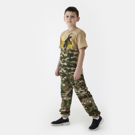 Размерный ряд: 104, 110, 116, 122, 128, 134, 140. Комплект: футболка, штаны. Ткань: кулирка плюс принт. Состав: 100% хлопок. В данной модели предусмотрен выбор расцветки: песочный, темно бежевый, светло желтый.