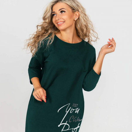Туника женская длиной до колена, объемная по груди и зауженная книзу, форма " баллон". Плечо спущенное, рукав 3/4. Горловина округлой формы с обтачкой. По середине переда выполнен дизайнерский принт.