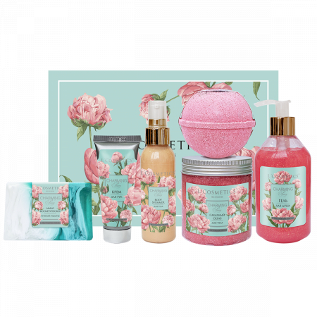 Состав: 1- BLOSSOM Charming Peony Твёрдое мыло С экстрактом пиона 100 г2- BLOSSOM Charming Peony Крем для рук С экстрактом пиона 75 мл3- BLOSSOM Charming Peony Шиммер для тела С экстрактом пиона 100 мл4- BLOSSOM Charming Peony Сахарный скраб для тела с шиммером С экстрактом пиона 250 мл5- BLOSSOM Charming Peony Гель для душа С экстрактом пиона 250 мл6- Relax Бурлящий шар с шиммером Гейзер Warm Feeling 260 г7- Коробка Подарочная крафт большая 236*166*95 (под обечайку)8- Обечайка для короба Пионы