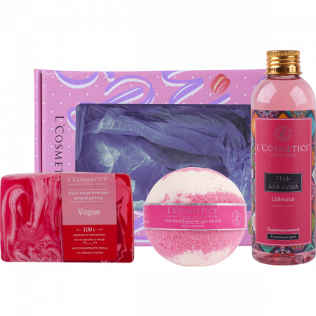включает в себя гель для душа La vie est belle “Севилья” объемом 200 мл, бурлящий шар “Роза в молоке” весом 120 грамм и твердое мыло “Vogue” весом 100 грамм. Этот подарочный набор станет прекрасным способом выразить свою заботу и внимание к близким, друзьям или коллегам.