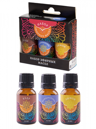 В комплекте три флакона по 15 мл с ароматами кедра, лимона и можжевельника.