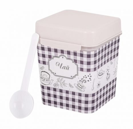Квадратная ёмкость с откидной крышкой предназначена для хранения наиболее востребованных сыпучих продуктов: чая, сахара и соли. Яркий рисунок нанесен на изделие при помощи технологии IML, он не стирается и не повреждается в процессе эксплуатации. Декор дарит особый колорит изделию и создает определенную стилистику кухни. Тематическая надпись на рисунке сообщает о том, что находится внутри ёмкости. Мерная ложка в комплекте с ёмкостью добавляет изделию удобство использования.