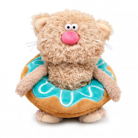 Очаровательный котик Какао из тактильно приятного эко меха цвета какао с молоком. Котик уютно расположился в милом пончике, который сшит из карамельного и голубовато?бирюзового софта. Пончик украшен вышивкой и имеет петельку для того, чтобы его можно было использовать в качестве подвеса. Размер: 16x8x9 см. Вес: 0,17 кг. Внимание: данная игрушка без упаковки!
