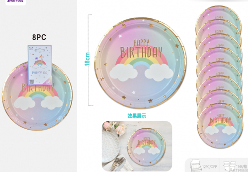 Набор бумажных тарелок (8 шт., 180 мм) — нежный и стильный аксессуар для украшения праздничного стола. Тарелки украшены пастельным рисунком с радугой, облаками и надписью "Happy Birthday", дополненными золотистыми звёздами, что делает их идеальным выбором для детских праздников, дней рождения или вечеринок в сказочном стиле.
