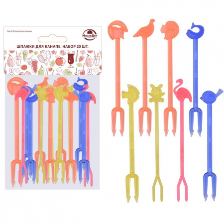 Шпажки для канапе-идеальное решение для праздничного стола. Для фуршетов и вечеринок нет ничего лучше канапе — миниатюрных закусок, нанизанных на шпажки. Фуршетные мини-закуски, приготовленные из овощей, ягод, фруктов, сыров, рыбных и мясных продуктов. На одной стороне изделия расположено острие, на другой декоративный элемент. Канапе нанизываются на шпажки и смотрятся оригинально на праздничном столе. Закуски актуальны не только на фуршете, но и на детском празднике, на вечеринке и как дополнение к банкетным блюдам. Кроме того, такие пики смогут заменить десертные вилочки, с их помощью можно брать небольшие закуски: кусочки сыра, картофель фри, оливки, креветки и т.п. Шпажки предназначены для многоразового использования.