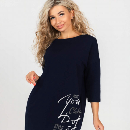 Туника женская длиной до колена, объемная по груди и зауженная книзу, форма " баллон". Плечо спущенное, рукав 3/4. Горловина округлой формы с обтачкой. По середине переда выполнен дизайнерский принт.