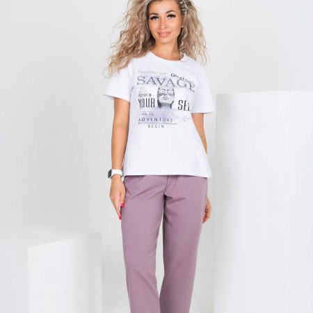 Брюки объемные к бедрам и зауженные к низу , длиной 7/8 , пояс на резинке с декоративными строчками , карманы внутренние боковые , по низу брюк открытый срез с отделочными строчками. Футболка женская классическая из трикотажного полотна Пике , умеренного объема, длиной до середины бедер, рукав втачной короткий . Горловина округлой формы с обтачкой. На середине переда дизайнерский принт . После стирки футболка дает усадку приблизительно на 2см .