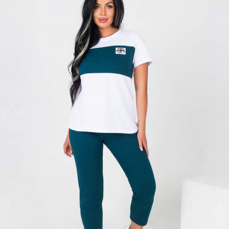 Костюм женский состоит из футболки и брюк. Футболка из трикотажного полотна ПИКЕ свободной формы, длиной до середины бедер, рукав втачной короткий, Перед с вставкой отделочного цвета и фирменным шевроном. Горловина округлой формы с обтачкой.Брюки полу прилегающего силуэта, длиной 7/8, карманы боковые внутренние, пояс на резинке с декоративными строчками. По низу брюк в боковых швах молнии.
