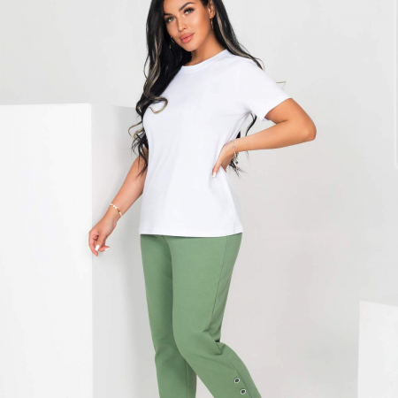 Брюки женские из трикотажного полотна футер 2 нитки с эластаном, свободные в области бедер и слегка зауженные к низу. В боковых швах имитация щлицы с декоративными пуговицами. Внутренние Боковые карманы с наклонным входом, пояс притачной с резинкой и декоративными строчками.