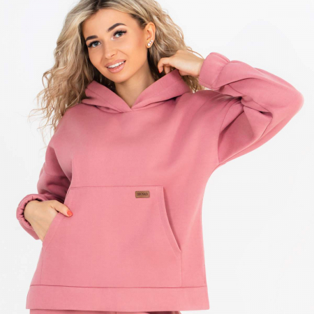 Толстовка свободной формы длиной до линии бедер на поясе с боковыми разрезами. Плечо спущенное, рукав длинный на манжете с резинкой. На кармане -кенгуру декоративная нашивка из эко кожи. Капюшон на подкладке из хлопка.