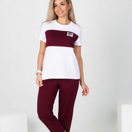Костюм женский состоит из футболки и брюк. Футболка из трикотажного полотна ПИКЕ свободной формы, длиной до середины бедер, рукав втачной короткий, Перед с вставкой отделочного цвета и фирменным шевроном. Горловина округлой формы с обтачкой.Брюки полуприлегающего силуэта, длиной 7/8, карманы боковые внутренние, пояс на резинке с декоративными строчками.