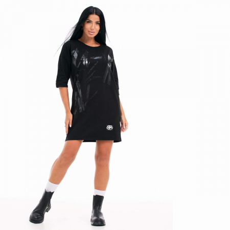 Туника женская длиной до колена, свободная, прямого силуэта. Плечо спущенное, рукав 3/4.Горловина округлой формы с обтачкой. Без карманов. По низу переда нашита фирменная нашивка-логотип.