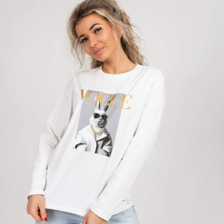 Лонгслив женский прямого силуэта, свободный , до линии бедер. Плечо спущенное, рукав втачной, длинный .Горловина округлой формы с обтачкой. Горловина спинки с усилением.Спереди оригинальный принт