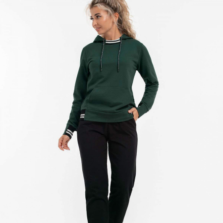 Костюм женский спортивный состоит из толстовки и брюк. Толстовка свободной формы прямого силуэта длиной до середины бедер, по низу пояс с вязанными трикотажными деталями. Рукава длинные, по низу манжеты с вязанными вставками. Капюшон с кулисой и шнурком и вязанной вставкой по горловине. Спереди карман -"кенгуру " и фирменный шеврон с логотипом. Брюки свободные, низ на манжетах с вязанными трикотажными вставками. Пояс притачной с резинкой и декоративными строчками.