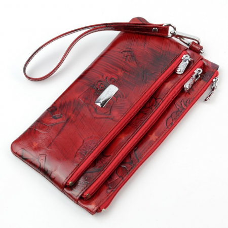 Имеет три отделения на молниях, в одно из которых вшит карман на три пластиковые карты. В комплекте съемный кожаный ремешок на запястье.
