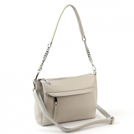 Женская сумка из натуральной кожи бежевого цвета. Снаружи, на лицевой стенке карман на молнии. Сумка закрывается на молнию. Внутри три отделения, два открытых и центральное на молнии. Внутри центрального отделения есть боковые кармашки, один на молнии и два открытых. Снаружи, на задней стенке есть кармашек на молнии. В комплекте короткий ремешок с цепочкой и регулируемый по длине наплечный ремень.