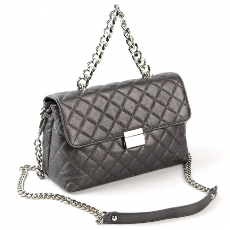 Женская стеганая сумка из натуральной кожи серебряного цвета. Имеет ручку-цепь, высотой 12 см. И наплечный ремешок-цепочку, длиной 120 см.