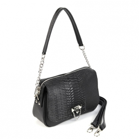 Женская сумка из натуральной кожи черного цвета. На лицевой стенке клапан с рамочным замком, из кожи под змею, под клапаном открытый карман. Сумка закрывается на металлическую молнию с двумя бегунками. Внутри отделение, разделенное карманом на молнии по середине и боковые кармашки, один на молнии и два открытых. Снаружи, на задней стенке карман на молнии. В комплекте короткий ремешок с цепочкой и регулируемый по длине наплечный ремень.