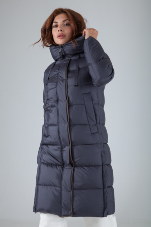 Современное пальто полуприталенного силуэта с контрастной отделкой. Застегивается на двухстороннюю молнию прикрытую планкой на кнопках. Глубокий несъемный капюшон регулируется тесьмой. Прорезные карманы на кнопке. Внутри рукавов трикотажные манжеты. По низу изделия молнии для широкого шага. Внутри изделия потайной карман. Длина: 105см.