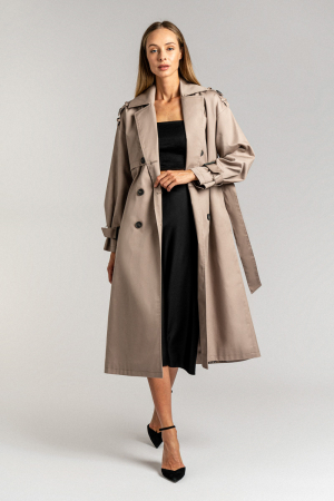 Двубортный хлопковый плащ со спущенными плечами, асимметричной кокеткой спереди, погонами на пуговицах, регулируемыми патами и карманами в швах. Длина изделия: 120 см. Рукав: Спущенное плечо. Длина рукава: 1/1 (63см). Застежка: Пуговицы 2 борта. Капюшон: Нет. Воротник: Английский. Пояс: Есть. Карманы: В швах. Кокетка: Спереди. Уход: Машинная стирка 30 С. Температурный режим: до +9° (рекомендуемые значения, учитывайте индивидуальные теплоощущения и особенности климата)
