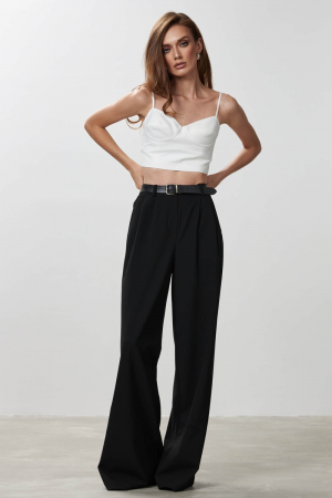 Брюки-палаццо из костюмной поливискозы. Модель свободного силуэта на притачном поясе со шлёвками. По спинке резинка. По переду карманы, защипы и застежка-гульфик. Длина — 110 см.