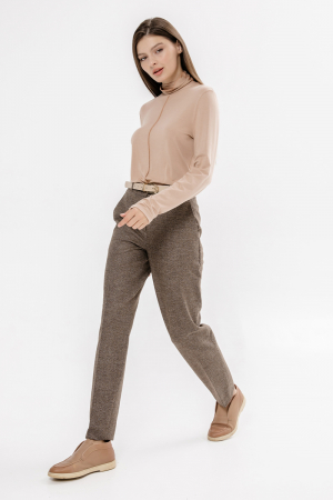 Брюки коричневые в клетку, средней ширины, со стрелками, резинка в поясе, слегка заужены книзу. Ткань плотная, костюмная.