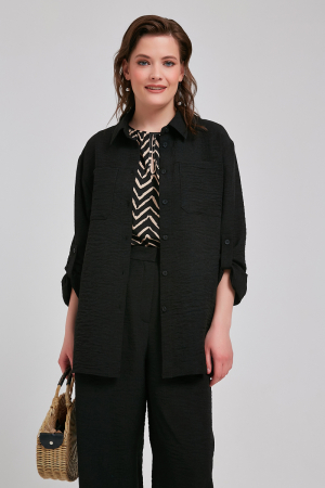 Блузка с эффектом крэш. Модель с кокетками. Спереди под кокетками накладные карманы, сзади - складки. По низу рукава защипы, окантованный разрез и манжета с застёжкой на пуговицу. Длина рукава регулируется патой, которая застёгивается на пуговицу. В боковых швах разрезы. Низ рубашки закруглён, длиннее по спинке. Подклад: Нет. Воротник: Сорочечный. Линия плеча: Спущенная. Карманы: Накладные. Длина изделия в росте: 164: 42р - 73см, 54р - 75,5см.
