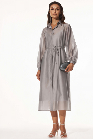 Двойное платье из воздушной вискозы. Модель состоит из нижнего слоя - платье комбинация из атласа; и верхнего слоя - платья-рубашки из воздушного тенселя. Застежка по переду на пуговицы. В комплекте тонкий пояс. Длина — 125 см.