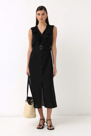 Женственное платье из высококачественного льна. Модель полуприлегающего силуэта. По переду рюша до линии талии, планка с функциональной застежкой на акцентные пуговицы. В комплекте пояс из основной ткани и пряжкой в тон пуговицам. Силуэт: Полуприлегающий. Длина: 125см.