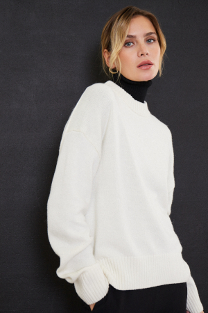 Свитер женский выполнен из трикотажа. Детали: округлый вырез горловины, длинный рукав, спущенная линия плеча, резинка по низу и на манжетах. Модный свитер oversize.