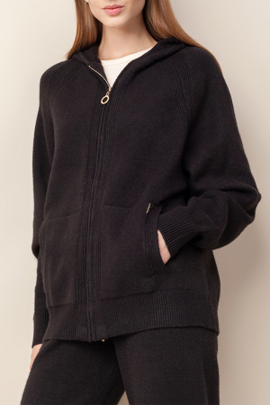 Худи на золотистой молнии выполнено из мягкой пряжи с кашемиром и ангорой. Уютное изделие отлично согревает, при этом не допуская перегрева. Под низ хорошо будет сочетать хлопковый топ или водолазку тонкой вязки. Модель дополнена карманами и фирменным логотипом бренда.