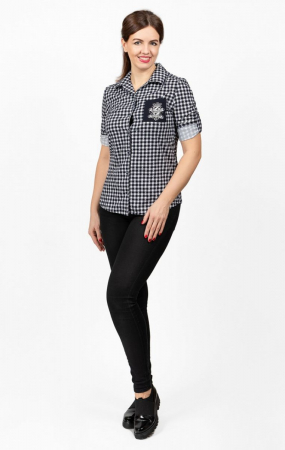 Рубашка на пуговицах из кулирки рулонной - реактив. Воротники борта дублированы флизелином, на накладном кармане принт. На рукавах пришиты патты на застежке - пуговицы.