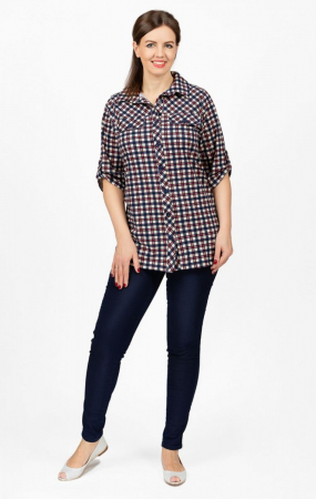 Рубашка женская из кулирки реактив. По переду пришиты кокетки с клапанами, по борту пришита планка для пуговиц. Воротник клапана и борт дублированы флизелином.