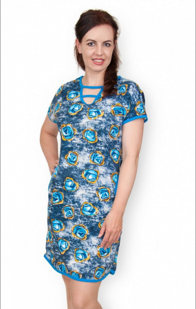 Туника с карманами из рулонной кулирки - реактив. Рукав спущенный, горловина обработана однотонной кулиркой.