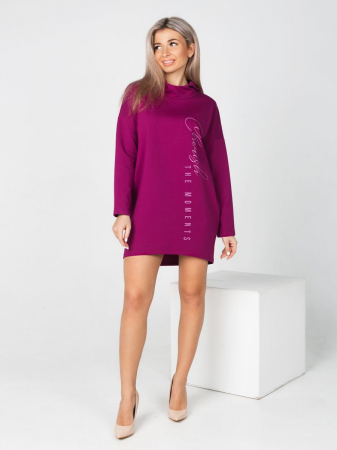 Туника женская длиной до колена, объемная по груди и зауженная к низу- форма " баллон". Плечо спущенное, рукав длинный. Оригинальный воротник-стойка с отложными концами. Без карманов. По середине переда выполнен дизайнерский принт.