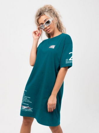 Туника женская свободной формы прямого силуэта длиной до колена, плечо спущенное, рукав втачной до локтя. Горловина округлой формы с обтачкой. Без карманов. Линия низа фигурной формы.На рукавах и спереди дизайнерские принты.
