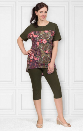 Костюм домашний из кулирки реактив (рулон) с гладкокрашенной кулиркой. По спинке и переду - кокетка, спущенный рукав. Низ по спинке удлиненный. Бриджи из однотонной кулирки.