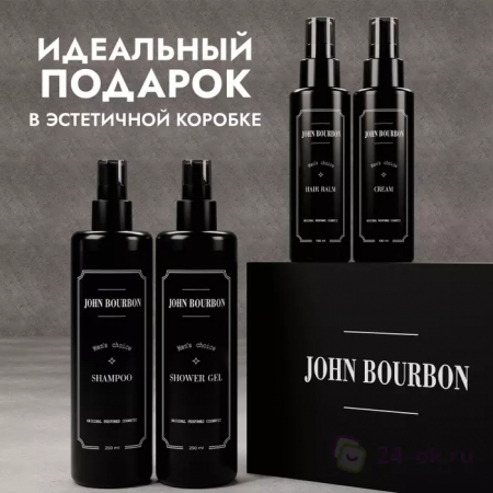 "Подарочный мужской набор ""John Bourbon"" – идеальный подарок для современного мужчины, который ценит качественный уход за собой! Этот роскошный набор содержит все необходимое для полноценного ухода: шампунь, гель для душа, увлажняющий крем и бальзам для волос. Все продукты имеют приятный мужской аромат с нотами удового дерева и бергамота, которые подчеркнут ваш стиль и образ. Шампунь и бальзам для волос создают полноценный комплекс ухода за кожей головы, волосами и бородой. Они обогащены ухаживающими компонентами, которые придадут вашим волосам блеск и здоровый вид, а парфюмированный состав подарит неповторимый аромат. Гель для душа нежно очищает кожу, оставляя ее освеженной и увлажненной, а увлажняющий крем с чайным деревом обеспечит максимальное увлажнение и питание кожи на протяжении всего дня. Компактный объем набора делает его идеальным для поездок и путешествий.