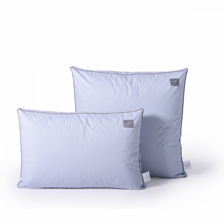 Пуховый, натуральный наполнитель ( 100% серый гусиный пух) самый износостойкий, чехол: серо-голубой тик ( 100% хлопок, плотность 140 г/м.кв.) .
