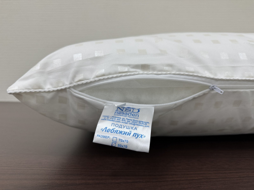 Подушка двухкаменрная "Лебяжий пух" в чехле из синтетического тика, плотностью 100 г/кв.м., с рисунком "шашка", с кантом, на молнии; наполнитель-искусственный лебяжий пух . Съемный чехол очень удобен в использовании, стирка при 40 градусах.