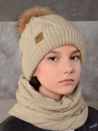 Дополнение: Комплект шапка+шарф-труба. Шапка удлиненной формы с переплетением "косами", с отворотом, с утеплителем, помпон из натурального меха на кнопке. Декор- шеврон. Шарф с таким же переплетением, на подкладке